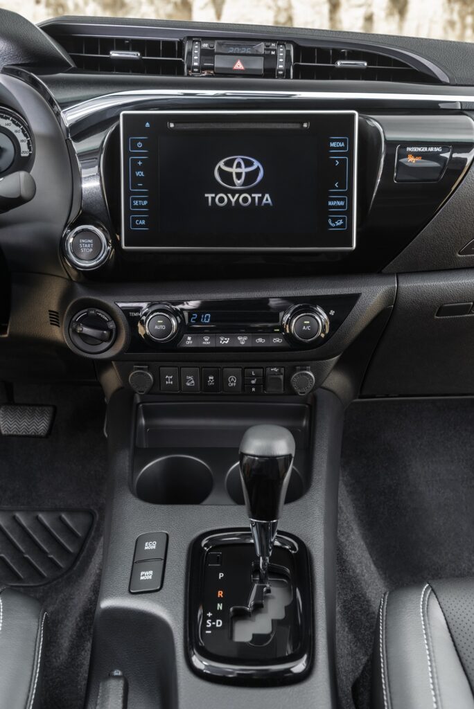 Pontuação: 8/10 Embora geneticamente um carro de trabalho, a Toyota Hilux, versão Tracker Premium Edition, apresenta-se naquela que é a configuração mais versátil, ou seja, de cabine dupla e quatro portas. Sendo que, embora esteja igualmente disponível com apenas três lugares, é nesta variante mais… “familiar”, com cinco verdadeiros lugares, bastante espaço para pernas, mas também um acesso alto – benditos estribos e pegas nos pilares! – e menos altura nos lugares traseiros – culpa da configuração tipo anfiteatro -, que mais qualidades apresenta. Isto porque, mesmo não renegando as suas origens de “Pura & Dura”, a Hilux acaba exibindo, nesta versão topo de gama, um cuidado especial e merecedor de elogios, desde logo, com os revestimentos. E traduzido, por exemplo, em cromados e plásticos negros brilhantes, no painel de instrumentos, no volante, em torno da alavanca da caixa de velocidade e nas portas. Igualmente a acentuar a exclusividade, o fundo branco do painel de instrumentos, onde também aparece um ecrã TFT com animação especifica sempre que se liga a ignição, e a própria chave, com um esboço do design frontal do modelo. Pormenores a que, contudo, também é preciso juntar um certo excesso de botões, principalmente no volante – de dimensões generosas mas também com óptima pega e multiregulável -, além da fraca capacidade da generalidade dos espaços de arrumação – a excepção são os dois porta-luvas -, maioritariamente abertos. Quanto à posição de condução, mostra-se alta e a apostar na visibilidade, tudo isto a partir de um banco em couro, confortável, mas sem muito apoio lateral, embora sem permitir que, especialmente nas manobras de marcha-atrás, não se valorize e agradeça a presença da câmara traseira. Cujas imagens captadas são exibidas no atraente ecrã de 7″ do sistema de multimédia Toyota Touch 2, incrustado no centro de uma consola da qual fazem igualmente parte os comandos do ar condicionado automático… e os botões que permitem engrenar o autoblocante no eixo traseiro, o sistema de apoio a descidas íngremes e o ESP. Bagageira? Há… transformada numa enorme caixa de carga, revestida, com mais de metro e meio de comprimento e metro e meio de largura. Além da capacidade para transportar até 805 kg de peso!